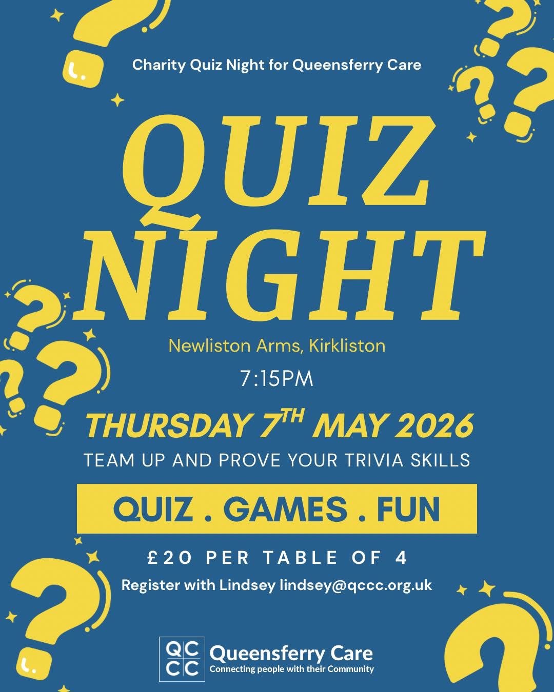 Join us for our fantastic fun Charity Quiz Night, Thursday 7th May 2026 7:15pm at Newliston Arms, Kirkliston
