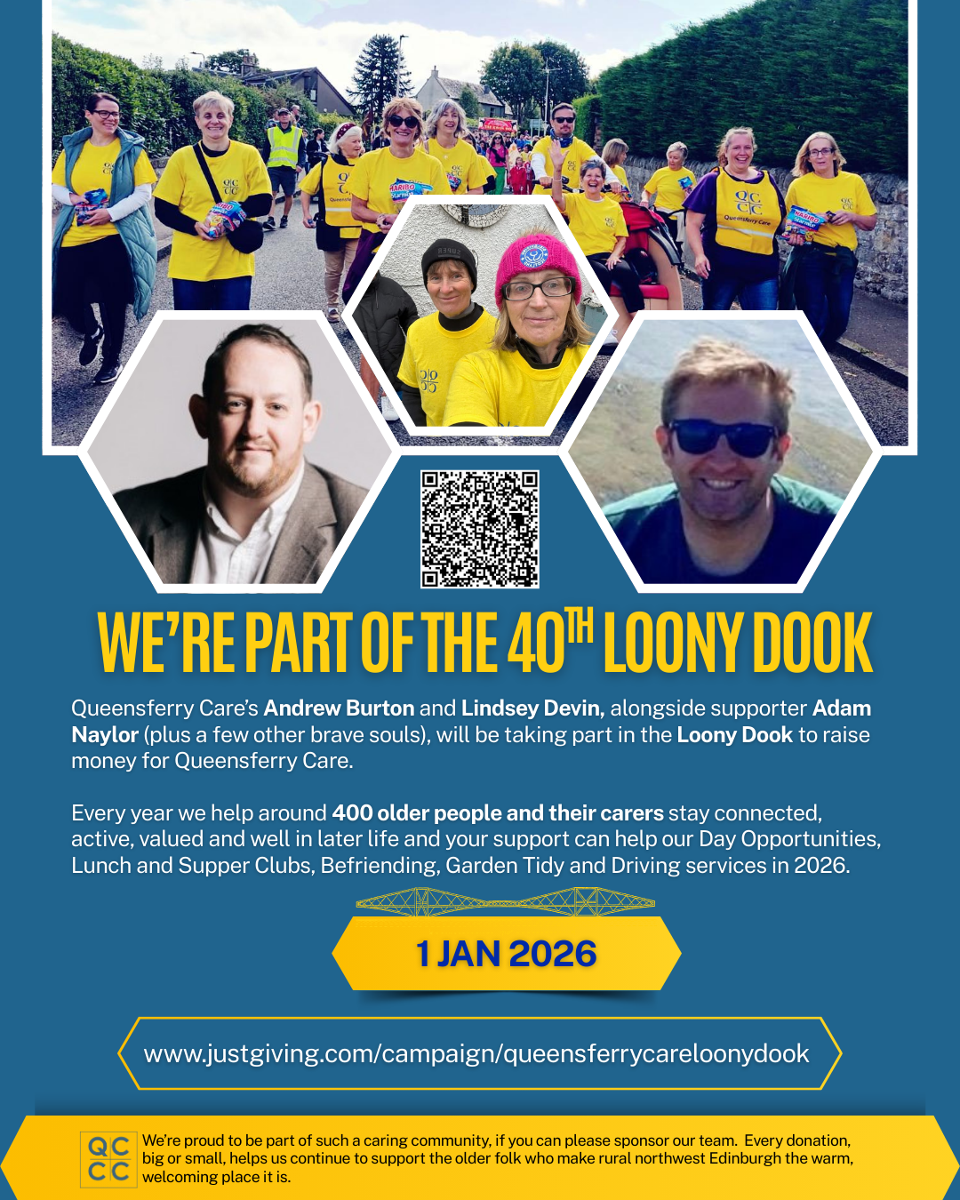 Queensferry Care has been supporting older people and carers across rural northwest Edinburgh for over 30 years - which means the Loony Dook is actually older than we are! Every year, we help around 400 local people stay connected, active, valued and well in later life. Your donation will help us continue to provide Day Opportunities at The Haven, Lunch and Supper Clubs, Support for Carers, Befriending and Community Connection, Practical help that makes everyday life easier and brighter. We're proud to be part of such a caring community and what better way to celebrate that than by freezing our toes off for a good cause?